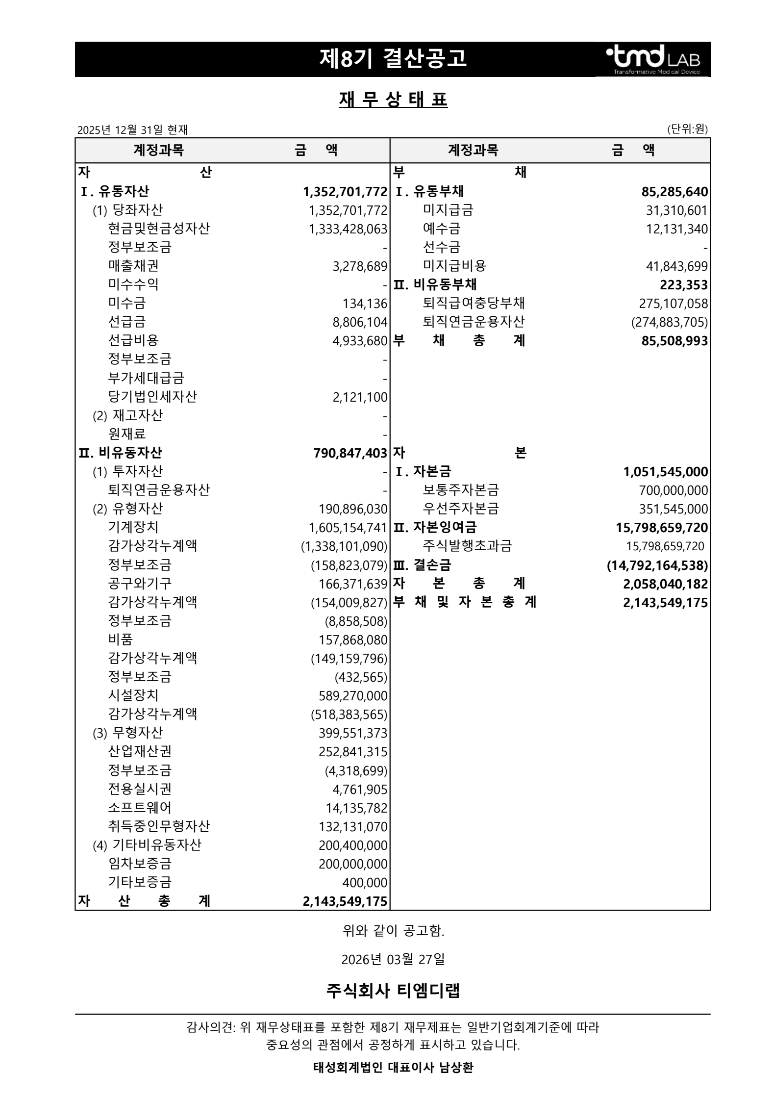 ㈜티엠디랩 제8기 결산공고 (26.03.27)